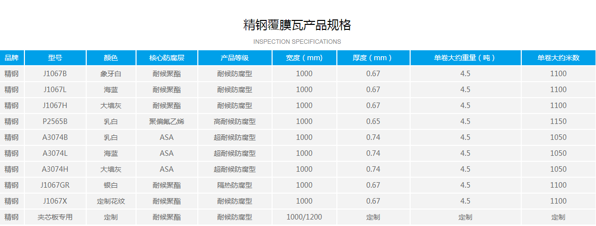 聚酯型:按顏色區分有J1067B、J1067L、J1067H、J1067X等型號,是表麵覆合改性耐候聚酯功能薄膜的型號,屬於耐候防腐通用型瓦,統一厚度為0.67mm,寬度為1000mm,每卷為4.5噸約1100米。能夠適用於大部分的廠房場景,耐候年限廠,防腐效果好。聚酯型J1067GR型號結構中增加了鏡麵鋁箔,光反射率達到81%以上,在防腐的同時還具有優良的隔熱性能,夏季高溫同比普通彩鋼瓦能夠降溫達8攝氏度以上,是恒溫恒濕車間、糧倉等等有隔熱要求的工業建材優選之材。